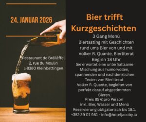 Ici vous pouvez ressentir la combinaison entre tradition et moderne, tout comme un esprit de famille. Cet endroit, qui évoque l’art de vivre luxembourgeois, a été mise en place par Aloyse Jacoby, ancien chef de l’équipe nationale de cuisiniers. Ce jour sa fille Fabienne Jacoby et son conjoint Ralph Schmitt ont repris le défi de garder leur niveau de qualité, tout en intégrant des services supplémentaires, comme p.ex. le sommelier de bière.